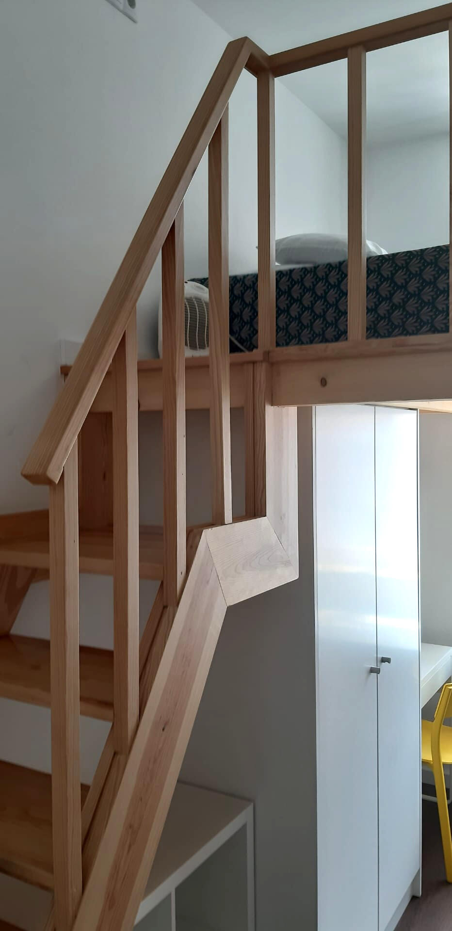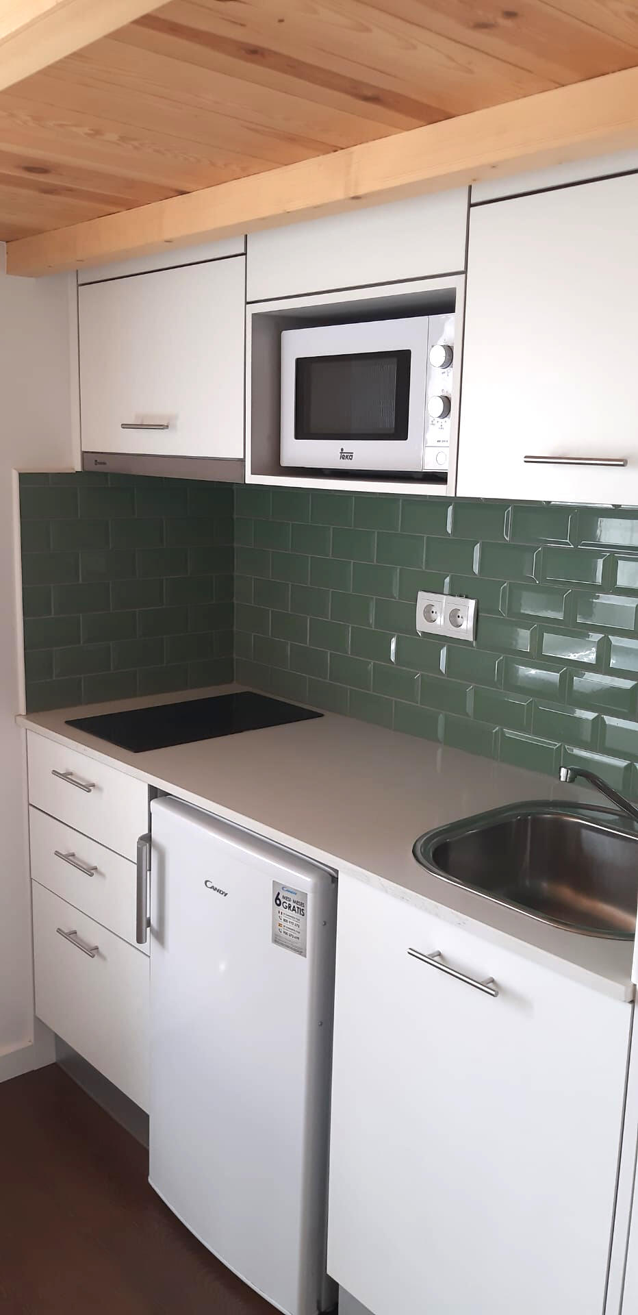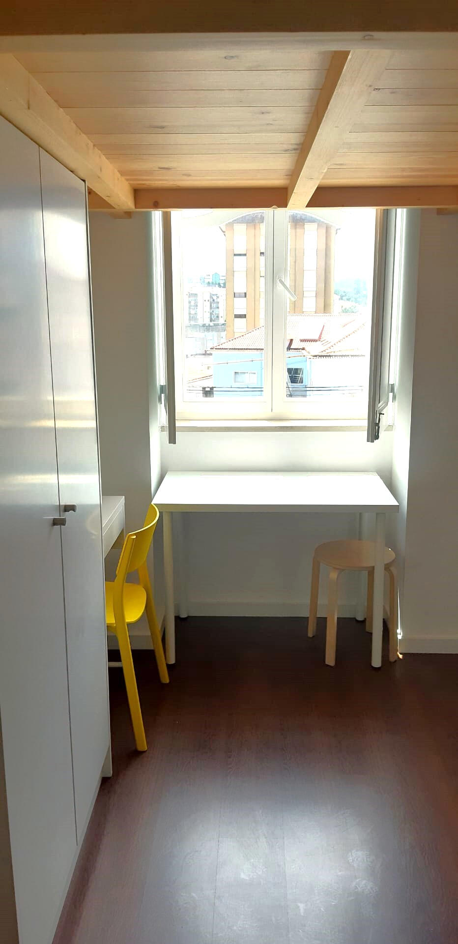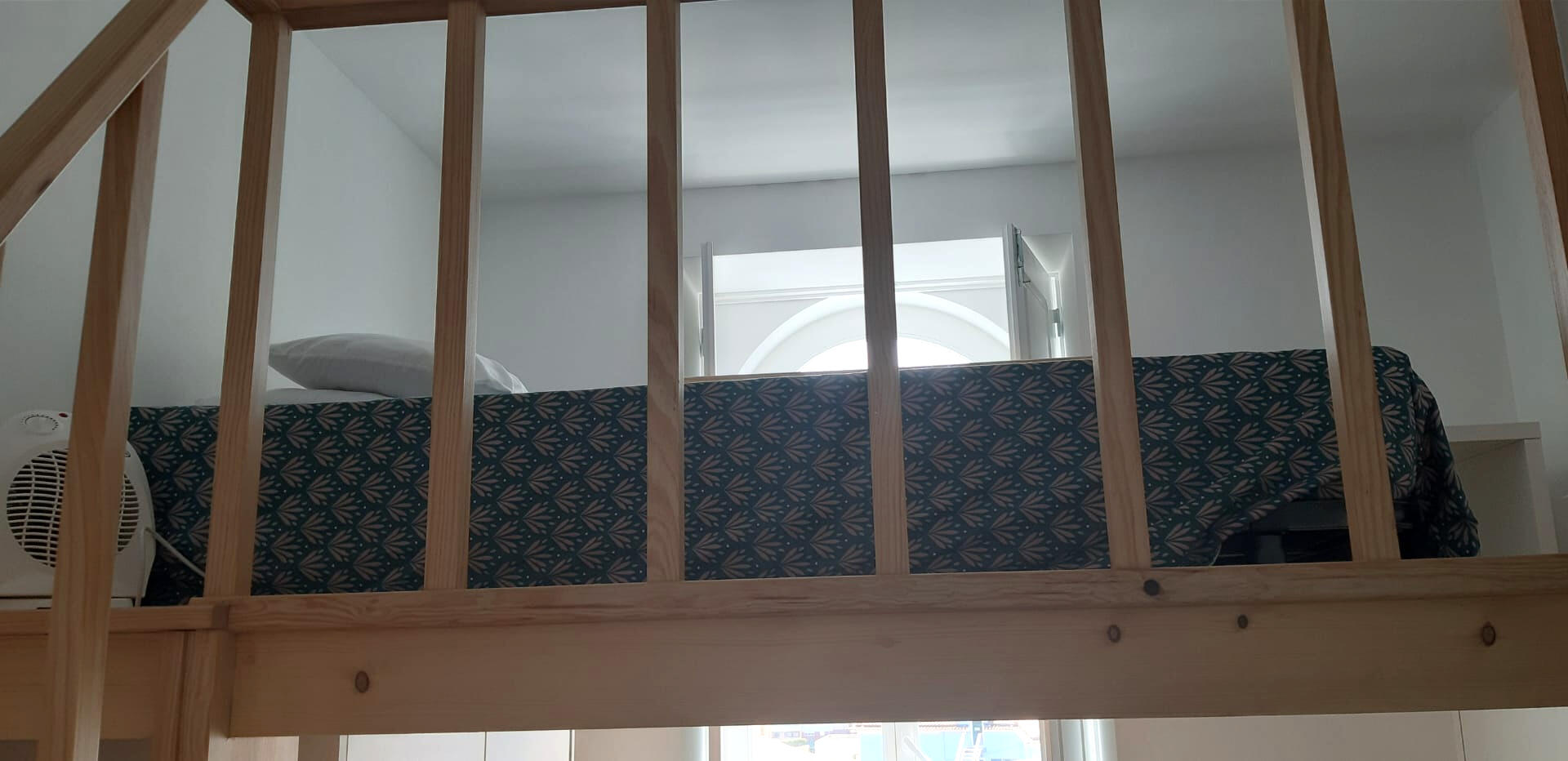 Estúdio com cama de casal em mezzanine, com acesso a pátio comum e lavandaria partilhada para entrada em maio.Studio witha double bed with mezzanine, access to a shared patio and a shared laundry room to enter in May.